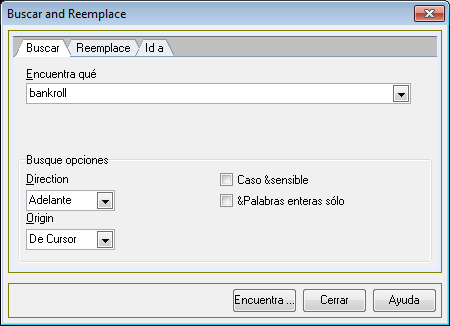 Encuentra qué: Entra uno busca ristra. Para hacer una selección de una lista de previamente en la que se entrado en buscan ristras, dan un clic sobre la flecha abajo al lado de lo entra caja El programa de mano recordará lo último 40 registran ítemes y pueden estar ubicados con la lista desplegable.