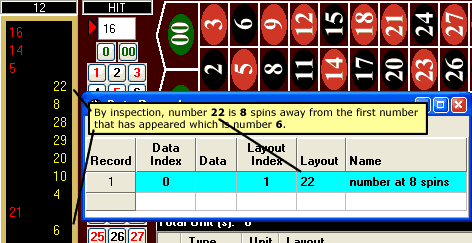 We want to locate a roulette number that is 8 spins from the first roulette number that has appeared and store that number to a data record number at 8 spins. The following example will perform this task.