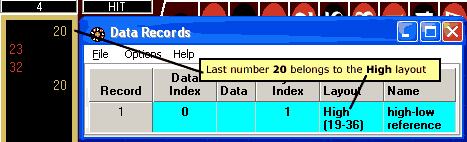 The High-Low is a supporting action identifier that is referencing the High and Low even money layouts. When a roulette number appears, the High-Low identifier will return the appropriate even money layout type of either High or Low. This reference can then be applied to the dest-record-layout.